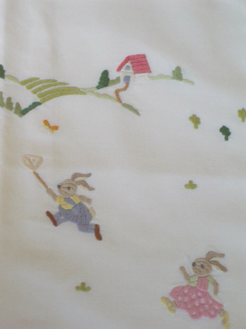 Bunny Rabbit design is hand embroidered with 2 bunnies in a country