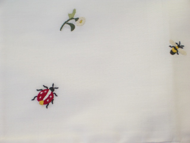 design has hand embroidered bugs, ladybirds, bees and beetles scattered